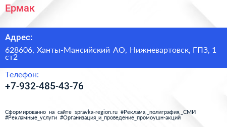 Ермак по адресу 628606, Ханты-Мансийский АО, Нижневартовск, ГПЗ, 1 ст2 в дальнейшем Организация, размещена в следующих категориях: