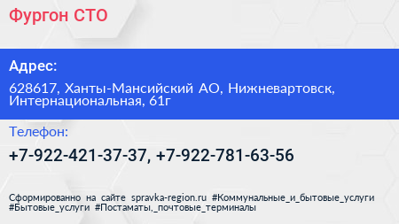 Фургон, СТО по адресу 628617, Ханты-Мансийский АО, Нижневартовск, Интернациональная, 61г в дальнейшем Организация, размещена в следующих категориях: