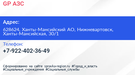 GP, АЗС по адресу 628624, Ханты-Мансийский АО, Нижневартовск, Ханты-Мансийская, 30/1 в дальнейшем Организация, размещена в следующих категориях: