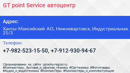 GT-point Service, автоцентр по адресу Ханты-Мансийский АО, Нижневартовск, Индустриальная, 21/3 в дальнейшем Организация, размещена в следующих категориях: