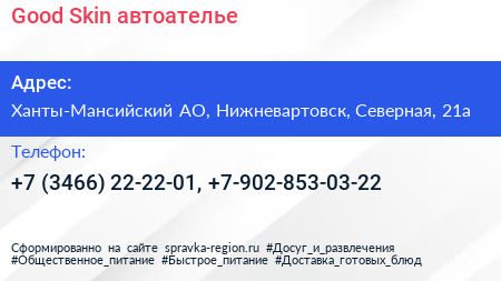 Good Skin, автоателье по адресу Ханты-Мансийский АО, Нижневартовск, Северная, 21а в дальнейшем Организация, размещена в следующих категориях: