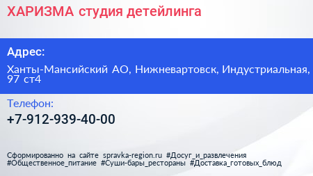 ХАРИЗМА, студия детейлинга по адресу Ханты-Мансийский АО, Нижневартовск, Индустриальная, 97 ст4 в дальнейшем Организация, размещена в следующих категориях: