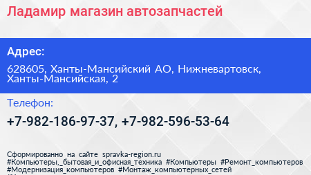 Ладамир, магазин автозапчастей по адресу 628605, Ханты-Мансийский АО, Нижневартовск, Ханты-Мансийская, 2 в дальнейшем Организация, размещена в следующих категориях: