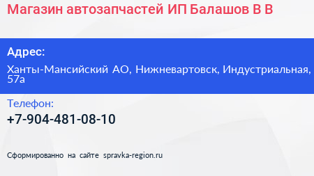 Магазин автозапчастей, ИП Балашов В.В. по адресу Ханты-Мансийский АО, Нижневартовск, Индустриальная, 57а в дальнейшем Организация, размещена в следующих категориях: