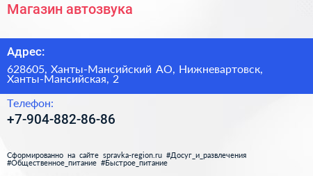 Магазин автозвука по адресу 628605, Ханты-Мансийский АО, Нижневартовск, Ханты-Мансийская, 2 в дальнейшем Организация, размещена в следующих категориях: