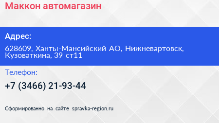 Маккон, автомагазин по адресу 628609, Ханты-Мансийский АО, Нижневартовск, Кузоваткина, 39 ст11 в дальнейшем Организация, размещена в следующих категориях:
