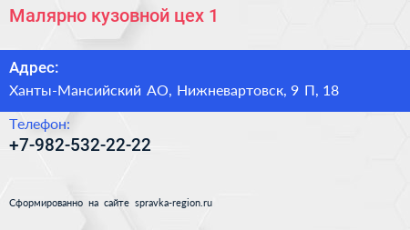 Малярно-кузовной цех №1 по адресу Ханты-Мансийский АО, Нижневартовск, 9 П, 18 в дальнейшем Организация, размещена в следующих категориях: