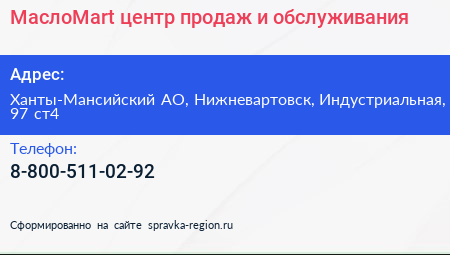 МаслоMart, центр продаж и обслуживания по адресу Ханты-Мансийский АО, Нижневартовск, Индустриальная, 97 ст4 в дальнейшем Организация, размещена в следующих категориях: