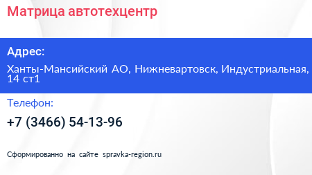 Матрица, автотехцентр по адресу Ханты-Мансийский АО, Нижневартовск, Индустриальная, 14 ст1 в дальнейшем Организация, размещена в следующих категориях: