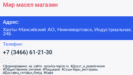 Мир масел, магазин по адресу Ханты-Мансийский АО, Нижневартовск, Индустриальная, 24Б в дальнейшем Организация, размещена в следующих категориях: