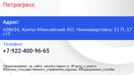 Петрогресс по адресу 628616, Ханты-Мансийский АО, Нижневартовск, 11 П, 17 ст1 в дальнейшем Организация, размещена в следующих категориях: