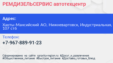 РЕМДИЗЕЛЬСЕРВИС, автотехцентр по адресу Ханты-Мансийский АО, Нижневартовск, Индустриальная, 107 ст6 в дальнейшем Организация, размещена в следующих категориях: