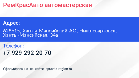 РемКрасАвто, автомастерская по адресу 628615, Ханты-Мансийский АО, Нижневартовск, Ханты-Мансийская, 34а в дальнейшем Организация, размещена в следующих категориях: