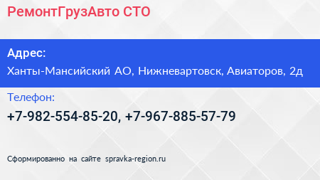 РемонтГрузАвто, СТО по адресу Ханты-Мансийский АО, Нижневартовск, Авиаторов, 2д в дальнейшем Организация, размещена в следующих категориях: