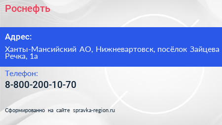 Роснефть по адресу Ханты-Мансийский АО, Нижневартовск, посёлок Зайцева Речка, 1а в дальнейшем Организация, размещена в следующих категориях: