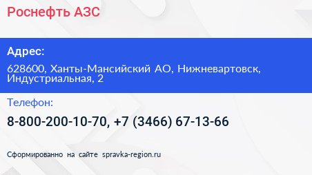 Роснефть, АЗС по адресу 628600, Ханты-Мансийский АО, Нижневартовск, Индустриальная, 2 в дальнейшем Организация, размещена в следующих категориях:
