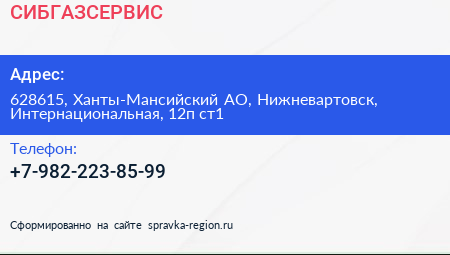 СИБГАЗСЕРВИС по адресу 628615, Ханты-Мансийский АО, Нижневартовск, Интернациональная, 12п ст1 в дальнейшем Организация, размещена в следующих категориях: