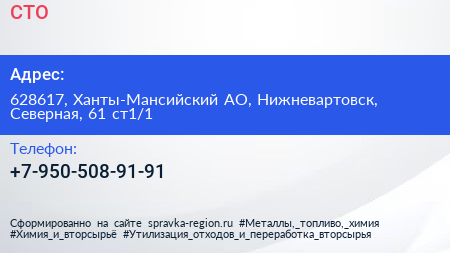 СТО по адресу 628617, Ханты-Мансийский АО, Нижневартовск, Северная, 61 ст1/1 в дальнейшем Организация, размещена в следующих категориях: