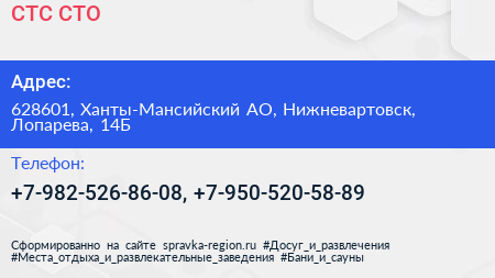 СТС, СТО по адресу 628601, Ханты-Мансийский АО, Нижневартовск, Лопарева, 14Б в дальнейшем Организация, размещена в следующих категориях: