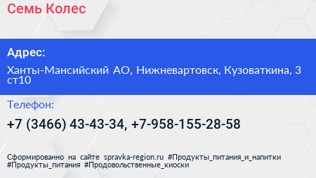 Семь Колес по адресу Ханты-Мансийский АО, Нижневартовск, Кузоваткина, 3 ст10 в дальнейшем Организация, размещена в следующих категориях: