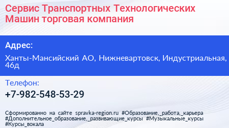 Сервис Транспортных Технологических Машин, торговая компания по адресу Ханты-Мансийский АО, Нижневартовск, Индустриальная, 46д в дальнейшем Организация, размещена в следующих категориях: