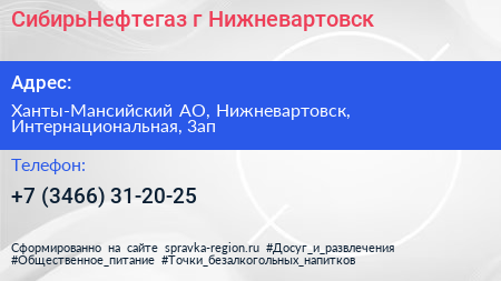 Для связи с организацией воспользуйтесь номером телефона: +7 (3466) 31-20-25. Ежедневно с 00:00 до 24:00. технический перерыв: пн-вс 7:30-8:00, вы можете обратиться в эту организацию.