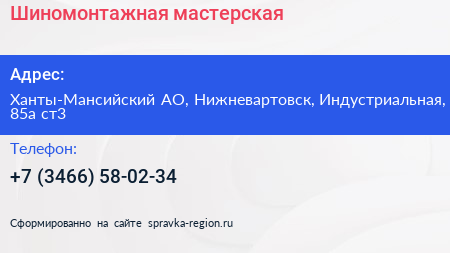 Шиномонтажная мастерская по адресу Ханты-Мансийский АО, Нижневартовск, Индустриальная, 85а ст3 в дальнейшем Организация, размещена в следующих категориях: