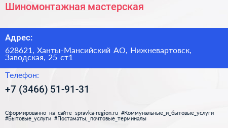 Шиномонтажная мастерская по адресу 628621, Ханты-Мансийский АО, Нижневартовск, Заводская, 25 ст1 в дальнейшем Организация, размещена в следующих категориях: