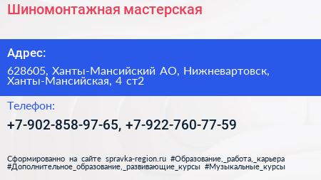 Шиномонтажная мастерская по адресу 628605, Ханты-Мансийский АО, Нижневартовск, Ханты-Мансийская, 4 ст2 в дальнейшем Организация, размещена в следующих категориях: