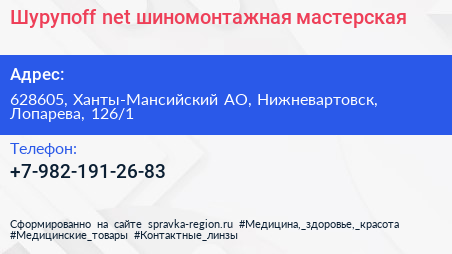 Шурупoff.net, шиномонтажная мастерская по адресу 628605, Ханты-Мансийский АО, Нижневартовск, Лопарева, 126/1 в дальнейшем Организация, размещена в следующих категориях: