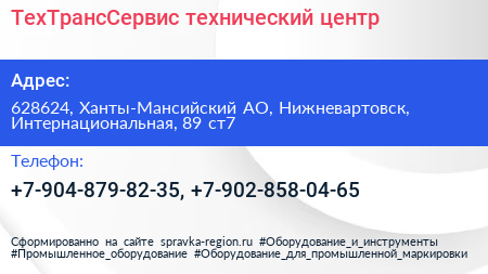ТехТрансСервис, технический центр по адресу 628624, Ханты-Мансийский АО, Нижневартовск, Интернациональная, 89 ст7 в дальнейшем Организация, размещена в следующих категориях: