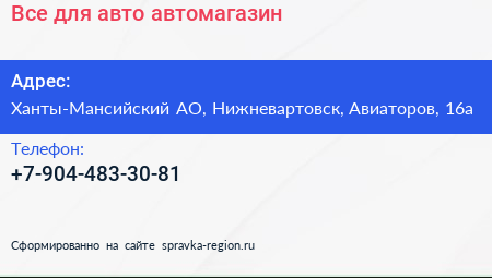 Все для авто, автомагазин по адресу Ханты-Мансийский АО, Нижневартовск, Авиаторов, 16а в дальнейшем Организация, размещена в следующих категориях: