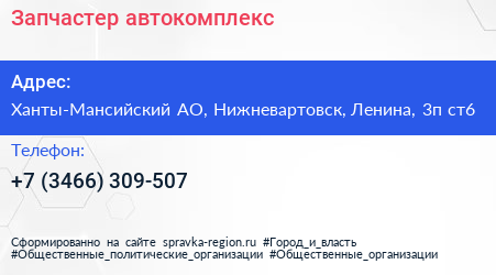 Запчастер, автокомплекс по адресу Ханты-Мансийский АО, Нижневартовск, Ленина, 3п ст6 в дальнейшем Организация, размещена в следующих категориях: