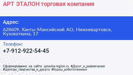 АРТ ЭТАЛОН, торговая компания по адресу 628609, Ханты-Мансийский АО, Нижневартовск, Кузоваткина, 17 в дальнейшем Организация, размещена в следующих категориях: