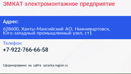 ЭМКАТ, электромонтажное предприятие по адресу 628600, Ханты-Мансийский АО, Нижневартовск, Юго-западный промышленный узел, ст1 в дальнейшем Организация, размещена в следующих категориях: