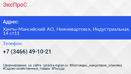 ЭксПроС по адресу Ханты-Мансийский АО, Нижневартовск, Индустриальная, 14 ст11 в дальнейшем Организация, размещена в следующих категориях: