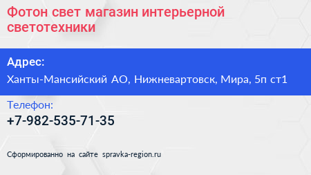 Фотон-свет, магазин интерьерной светотехники по адресу Ханты-Мансийский АО, Нижневартовск, Мира, 5п ст1 в дальнейшем Организация, размещена в следующих категориях: