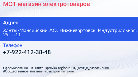 МЭТ, магазин электротоваров по адресу Ханты-Мансийский АО, Нижневартовск, Индустриальная, 29 ст11 в дальнейшем Организация, размещена в следующих категориях: