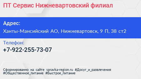 ПТ-Сервис, Нижневартовский филиал по адресу Ханты-Мансийский АО, Нижневартовск, 9 П, 38 ст2 в дальнейшем Организация, размещена в следующих категориях: