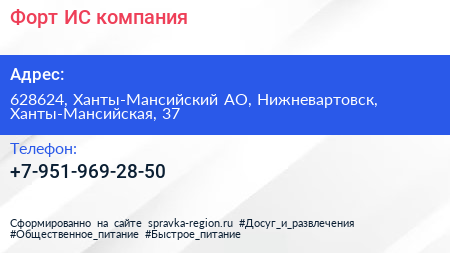 Форт-ИС, компания по адресу 628624, Ханты-Мансийский АО, Нижневартовск, Ханты-Мансийская, 37 в дальнейшем Организация, размещена в следующих категориях: