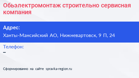 Обьэлектромонтаж, строительно-сервисная компания по адресу Ханты-Мансийский АО, Нижневартовск, 9 П, 24 в дальнейшем Организация, размещена в следующих категориях: