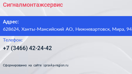 Сигналмонтажсервис по адресу 628624, Ханты-Мансийский АО, Нижневартовск, Мира, 94 в дальнейшем Организация, размещена в следующих категориях: