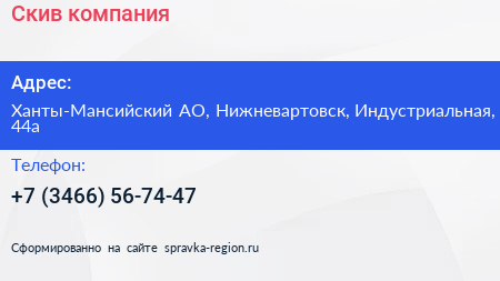 Скив, компания по адресу Ханты-Мансийский АО, Нижневартовск, Индустриальная, 44а в дальнейшем Организация, размещена в следующих категориях: