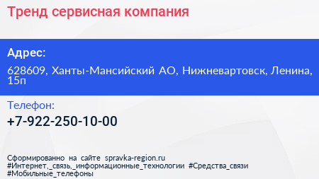Тренд, сервисная компания по адресу 628609, Ханты-Мансийский АО, Нижневартовск, Ленина, 15п в дальнейшем Организация, размещена в следующих категориях: