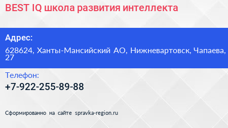 BEST IQ, школа развития интеллекта по адресу 628624, Ханты-Мансийский АО, Нижневартовск, Чапаева, 27 в дальнейшем Организация, размещена в следующих категориях: