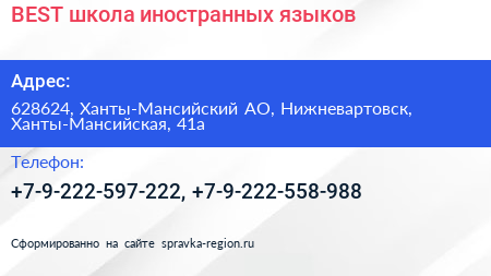 BEST, школа иностранных языков по адресу 628624, Ханты-Мансийский АО, Нижневартовск, Ханты-Мансийская, 41а в дальнейшем Организация, размещена в следующих категориях: