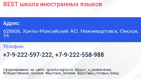 BEST, школа иностранных языков по адресу 628606, Ханты-Мансийский АО, Нижневартовск, Омская, 14 в дальнейшем Организация, размещена в следующих категориях: