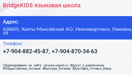 BridgeKIDS, языковая школа по адресу 628605, Ханты-Мансийский АО, Нижневартовск, Пикмана, 49 в дальнейшем Организация, размещена в следующих категориях: