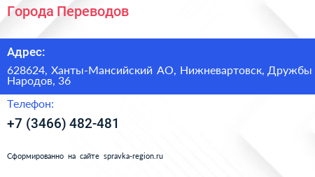 Города Переводов по адресу 628624, Ханты-Мансийский АО, Нижневартовск, Дружбы Народов, 36 в дальнейшем Организация, размещена в следующих категориях: