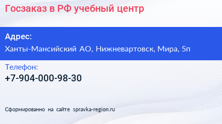 Госзаказ в РФ, учебный центр по адресу Ханты-Мансийский АО, Нижневартовск, Мира, 5п в дальнейшем Организация, размещена в следующих категориях: